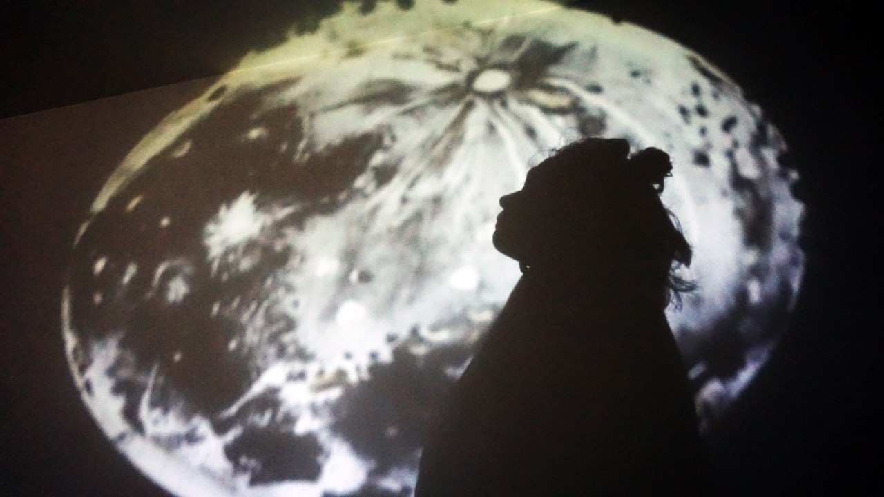 Desk Lamp, mirror, powder and petroleum jelly – the likeness of the moon is drawn using dust on a circular mirror, a desk lamp reflects the image onto the wall