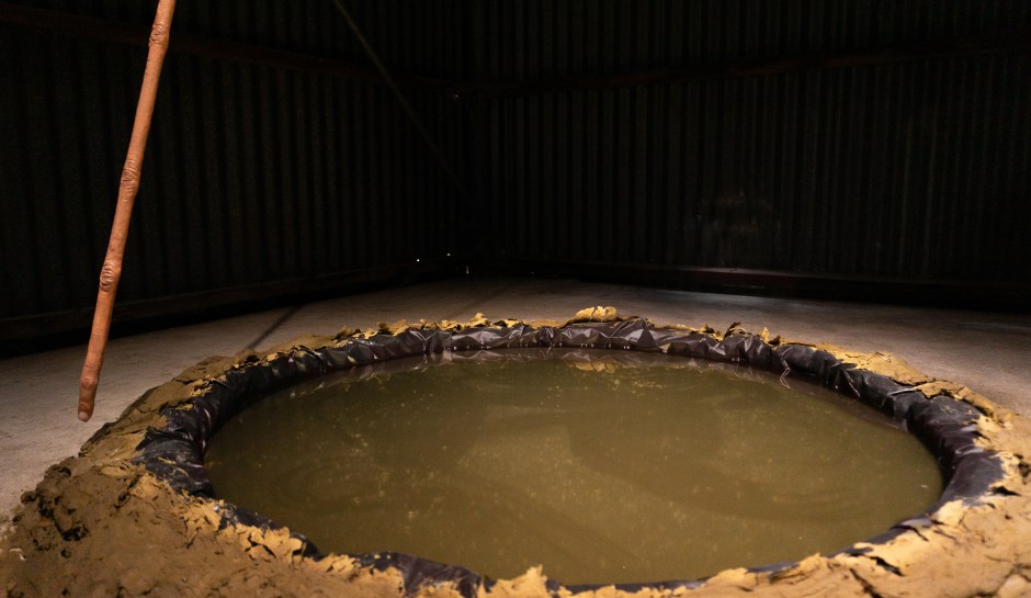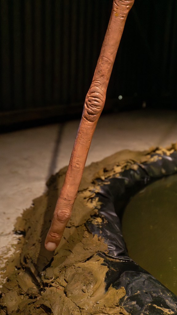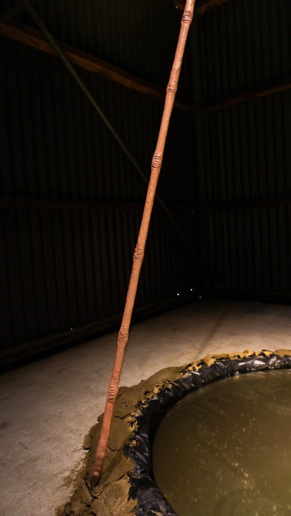 Portal, 2025, 3.5m x 1.5m x1.5m, wood, plaster, silicone, motor, mirror, water, bricks, builders plastic, clay from local property