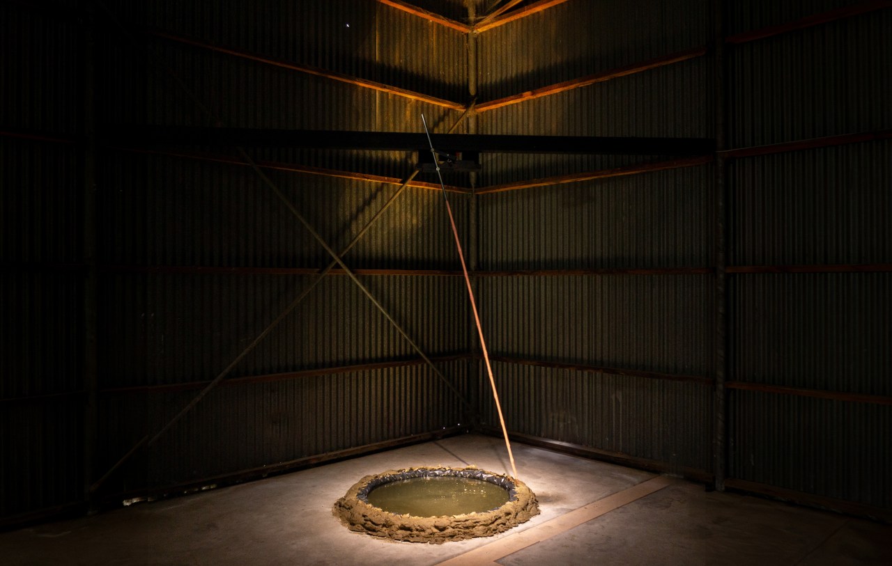 Portal, 2025, 3.5m x 1.5m x1.5m, wood, plaster, silicone, motor, mirror, water, bricks, builders plastic, clay from local property